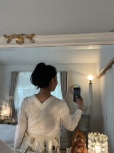 今日はポニーテールをくるんと後ろでクリップで留めて短く見えるようにしました。